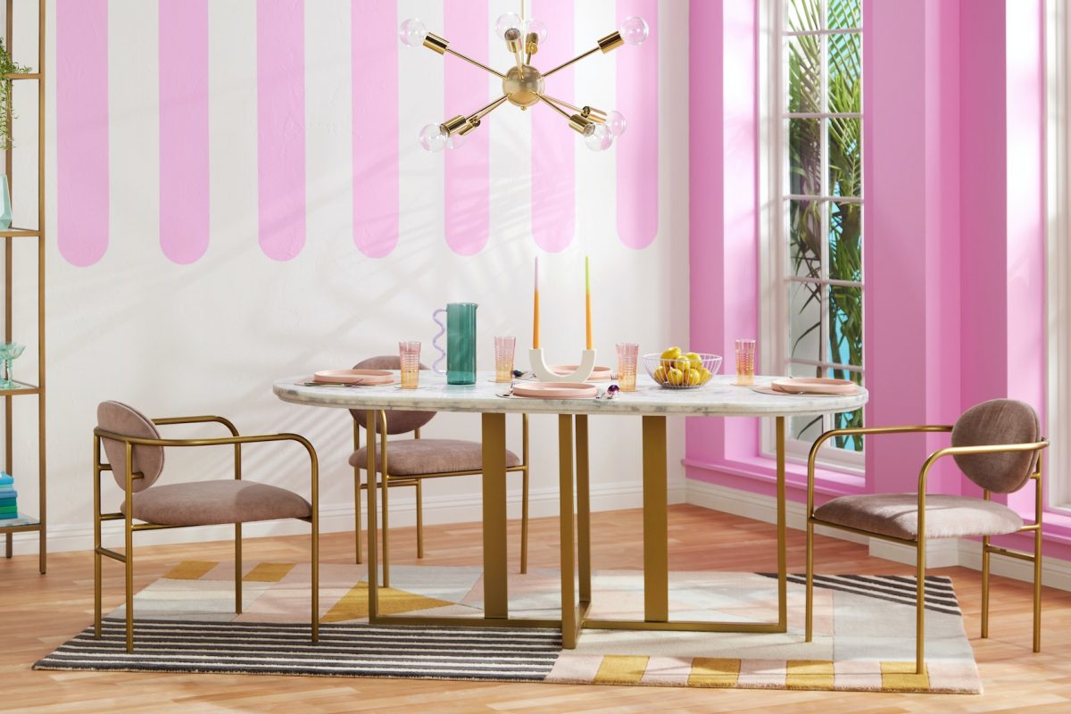 But there’s beauty to my critical analysis. Walker is happy to enlighten me. “To Joybird, the Barbiecore aesthetic means embracing color and creating bold and aspirational spaces that bring joy and empowerment to our customers.” Joybird’s Barbie-inspired collection draws upon core elements of the trend—”think brave contrasting colors, chic marble, golden accents, curved lines, and endless style possibilities,” says Walker.