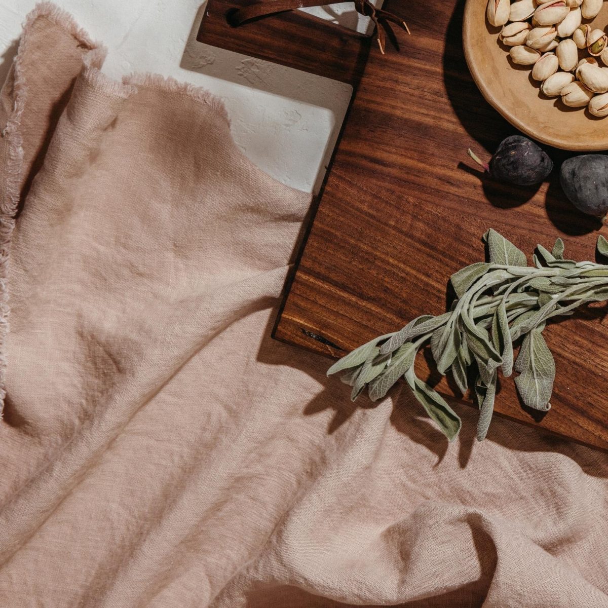 Gone are the days of perfectly-starched linen tablecloths. These days, I almost always opt for a casual woven table runner or linen table throw that lets the beauty of a wood table show through. For this look, I casually pulled a fringed linen napkin through this beautiful wheat napkin ring for a look that’s both thoughtful and relaxed. If you want, you could tuck a place card just next to the napkin so that each guest knows where to sit.